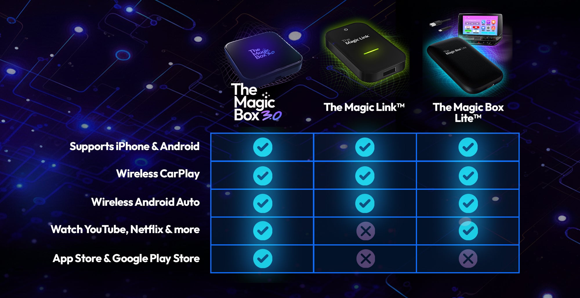 Instantly turn your wired Apple CarPlay and/or Android Auto wireless. Connect the Magic Link to any iPhone or Android and never plug your phone in again.