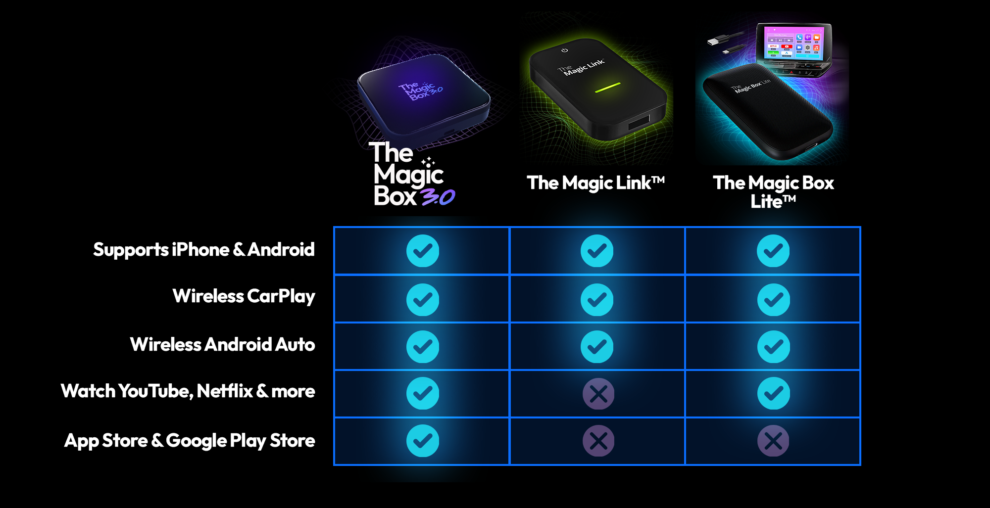 Instantly turn your wired Apple CarPlay and/or Android Auto wireless. Connect the Magic Link to any iPhone or Android and never plug your phone in again.