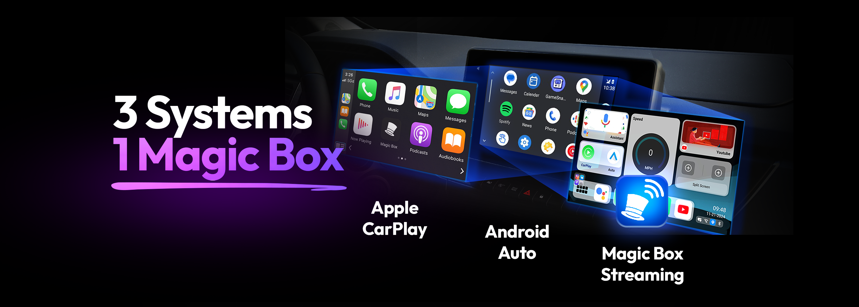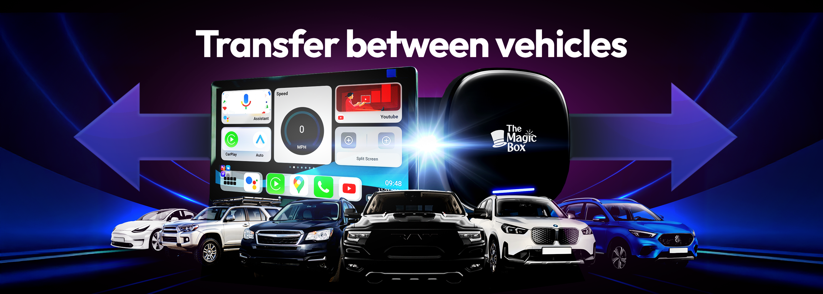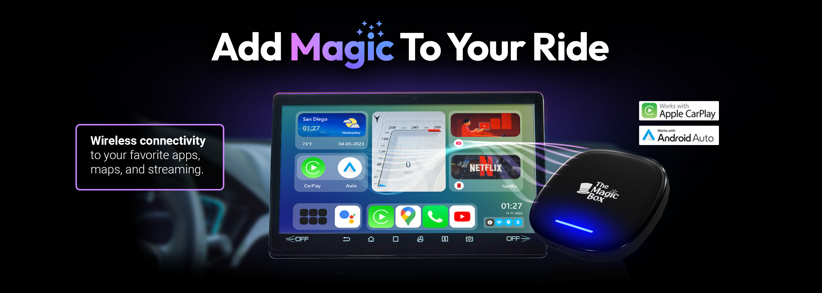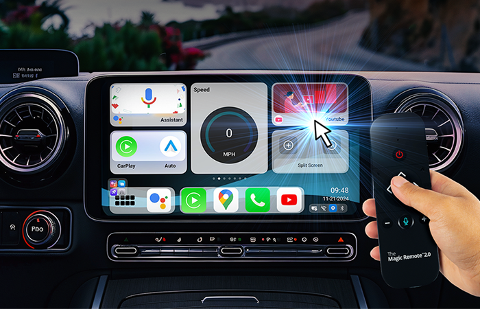 Turn your cars display screen into a smart TV using The Magic Box™ 2.0. Simply plug The Magic Box™ 2.0 into your car's USB port and the regular CarPlay or Android Auto screen will be replaced with ours. Download any app and start streaming with The Magic Box™ 2.0.