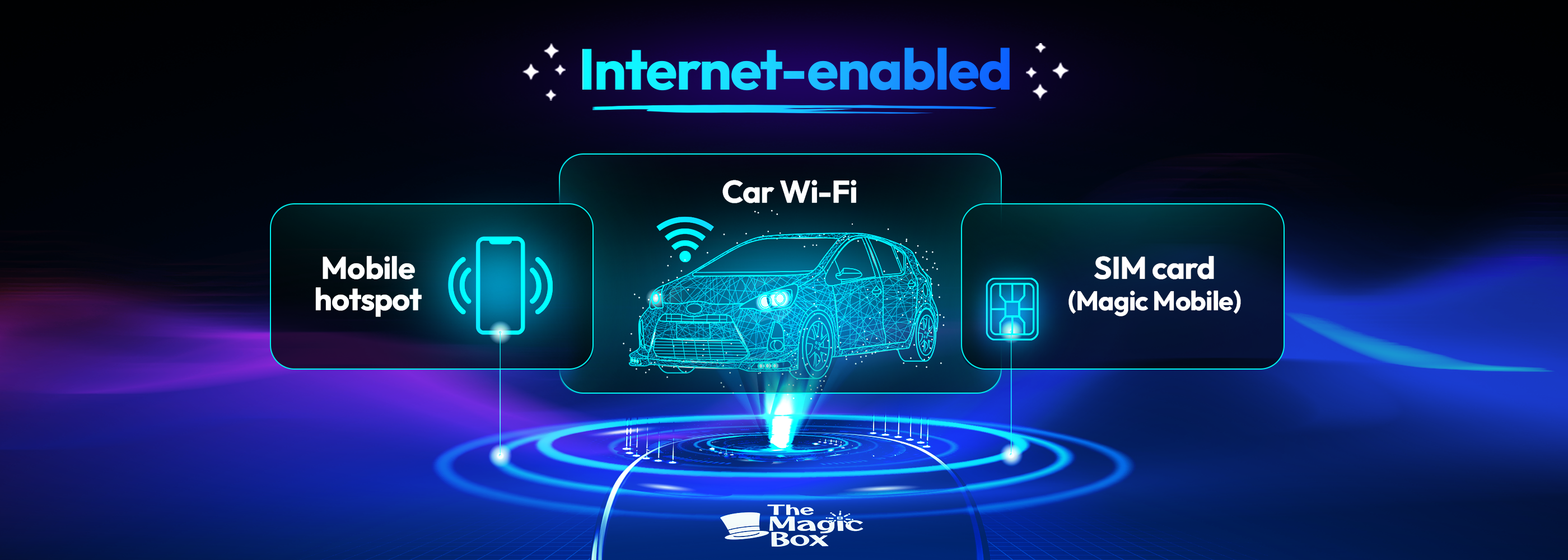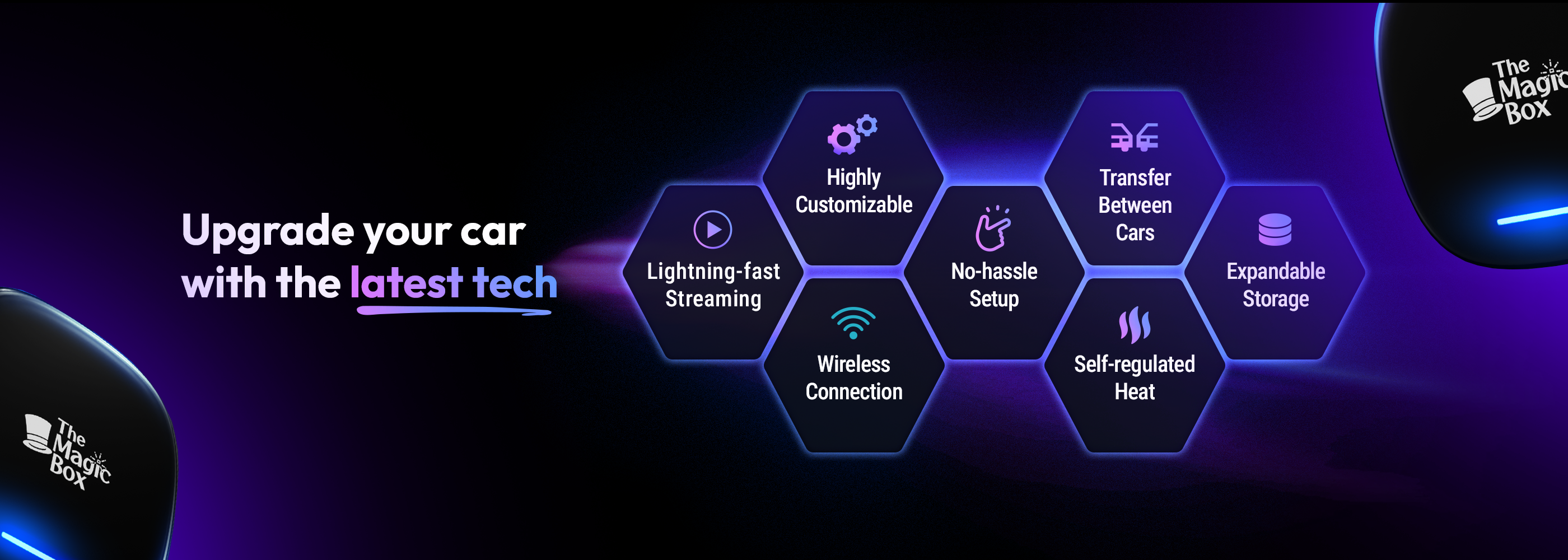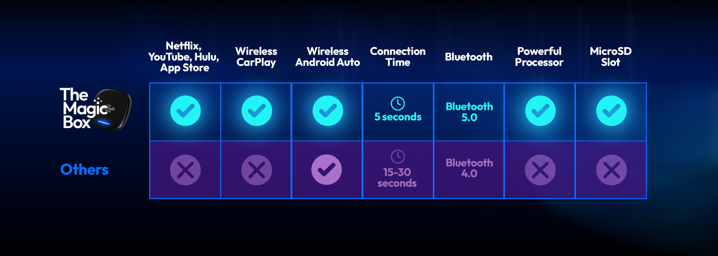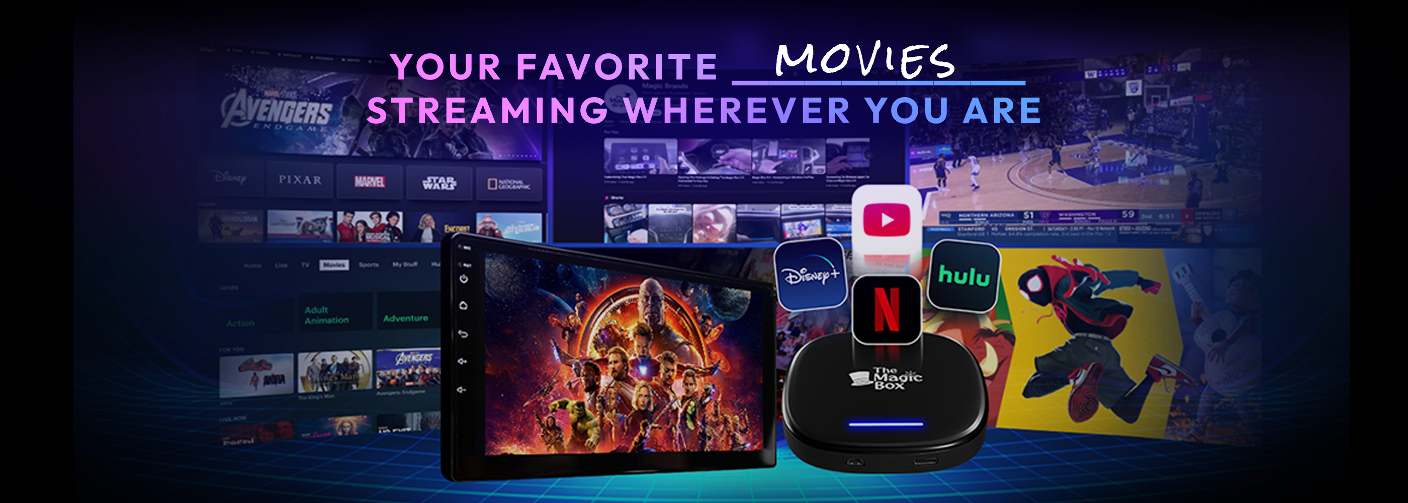 Turn your cars display screen into a smart TV using The Magic Box™ 2.0. Simply plug The Magic Box™ 2.0 into your car's USB port and the regular CarPlay or Android Auto screen will be replaced with ours. Download any app and start streaming with The Magic Box™ 2.0.